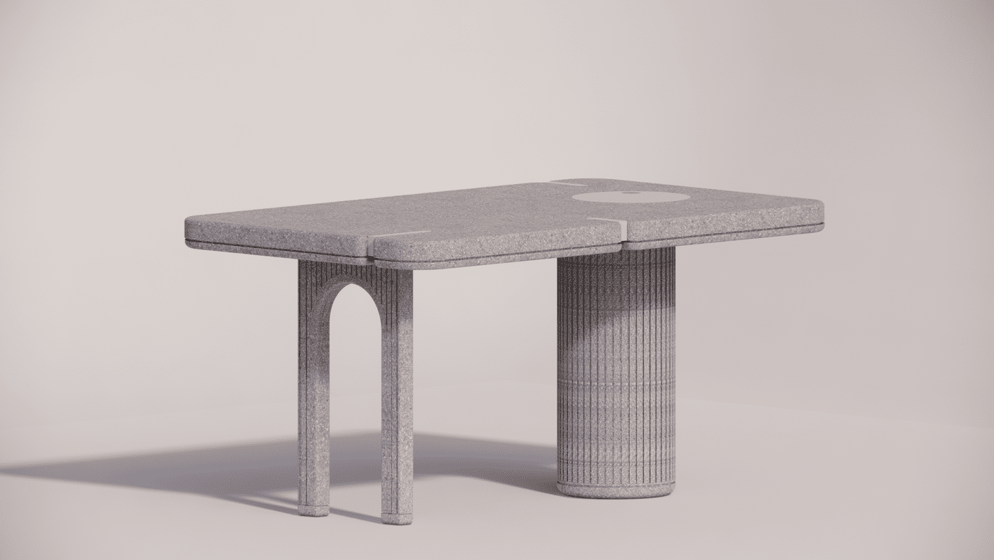 The table is inspired from architectural forms - arches and columns. The eventual visual was a thin slice resting on a cylinder and an arch.